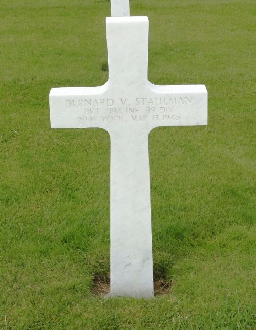 Pvt Bernard V. Stahlman was a lumberman before he enlisted in Buffalo, New York on 27 July 1944.Source of information: Peter Schouteten, www.abmc.gov, www.wwiimemorial.com, www.archives.gov – WWII Enlistment Record, www.ancestry.com - U.S., Headstone and Interment Records for U.S. Military Cemeteries on Foreign Soil / Sharon’s Family Tree / U.S., Social Security Death Index