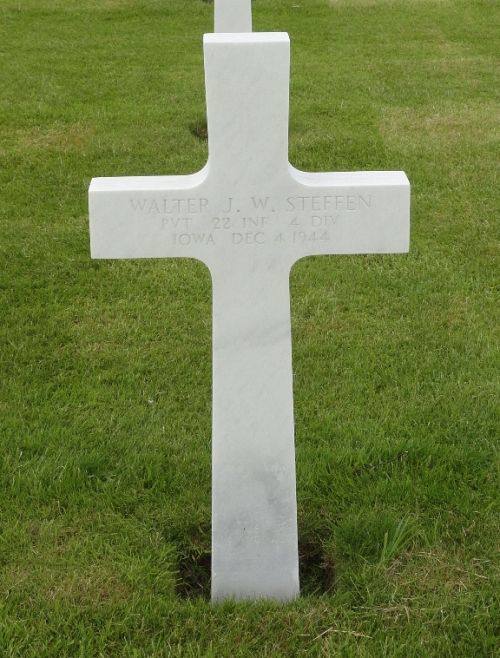 Pvt Walter J. W. Steffen enlisted in Camp Dodge Herrold, Iowa on 3 April 1944. He trained at Camp Robert, California and was sent overseas on 24 October 1944.He attended high school for 1 year and worked on a farm before he enlisted.