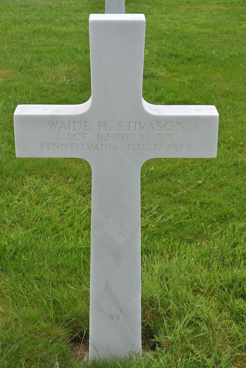 S/Sgt Waide H. Stivason enlisted in Butler, Pennsylvania on 17 February 1941.He was posthumously awarded the Silver Star Medal for actions on 16 December 1944 in Germany. His citation cited: "When the Germans overran his mortar positions during the initial phase of their offensive in December, Sgt Stivason organized his unit into a rifle squad and vigorously defended the area against the overwhelming enemy forces. Aggressively leading his squad in the face of the heavy enemy artillery, armor and small arms fire, he inflicted several casualties against the enemy. An enemy artillery shell struck a dugout where Sgt Stivason had previously carried some of his wounded comrades and set the building afire. While extricating the injured men Sgt Stivason suffered wounds and severe burns. He became missing in subsequent action against the enemy. Sergeant Stivason's gallant and courageous action reflects great credit on him and the Armed Forces of the United States.