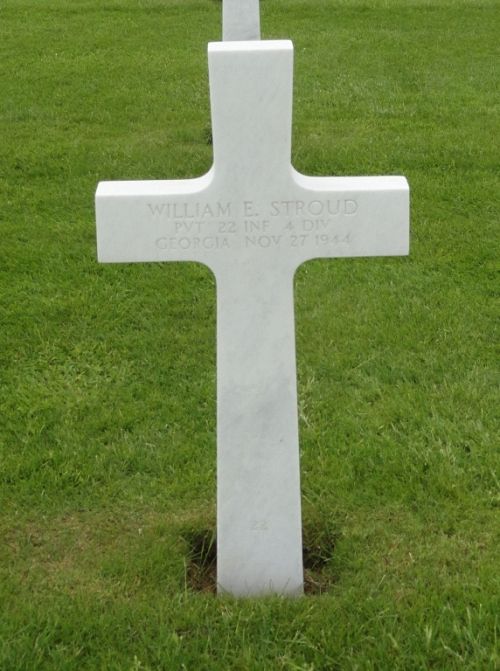 Pvt William E. Stroud worked on a farm before he enlisted at Fort McPherson, Atlanta on 21 April 1944.Pvt Stroud is remembered at the Sumach Cumberland Presbyterian Cemetery in Crandall, Murray County, Georgia.