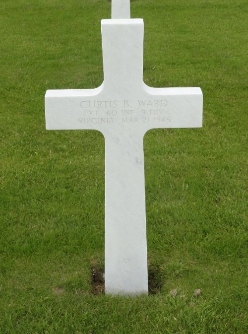 Pvt Curtis B. Ward was a carpenter before he enlisted in Richmond, Virginia on 16 August 1944.Source of information: Peter Schouteten, Carla Mans, www.abmc.gov, www.wwiimemorial.com, www.archives.gov – WWII Enlistment Record, www.ancestry.com - Headstone and Interment Record / U.S. WWII Draft Cards Young Men / 1930/1940 Census, http://9thinfantrydivision.net
