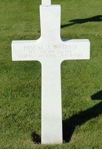 Pascal J. Watkins graduated from Fairview High School and Wingate Junior College.He enlisted in Fort Bragg, North Carolina on 7 April 1944.