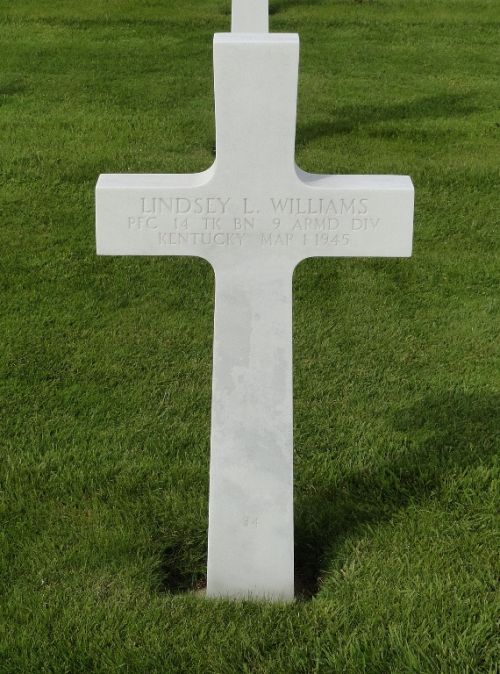 Pfc Lindsey L. Williams was first buried at Temporary American Military Cemetery Henri-Chapelle, Belgium Block YYY, Row 10, Grave 185.