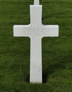 Sgt Gordon E. Willis enlisted in Los Angeles, California on 22 March 1943.He was awarded the Bronze Star Medal posthumously. The citation cited: For heroic achievement in connection with military operations against the enemy, on 24 January 1945 in Belgium. During the attack near Grand Halleux, it was necessary for the 3rd Battalion to cross several hundred yards of open field, under very intense machine gun fire. When the company on the right flank became held up by the enemy, he immediately employed a 60mm mortar and eliminated the position, allowing the attack to continue. Later when company became pinned down by machine gun fire, he, without orders called for a mortar and ammunition and using only the tube, holding it between his legs, he expended over 30 rounds hitting one enemy position and forcing the enemy to withdraw, allowing company to continue the advance. He was killed in the ensuing action. This display of initiative, leadership and self sacrifice, for which he gave his life is of the highest order and commands the greatest credit.