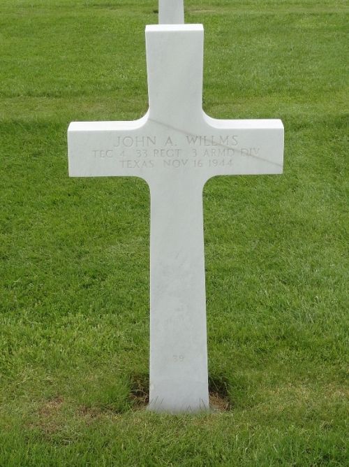T/4 John A. Willms was first buried at Temporary American Military Cemetery Henri-Chapelle, Belgium Block U, Row 7, Grave 124.Source of information: Peter Schouteten, Carla Mans, www.abmc.gov, www.wwiimemorial.com, www.archives.gov – WWII Enlistment Record, www.ancestry.com - Headstone and Interment Record / U.S. WWII Draft Cards Young Men / June's Howertons