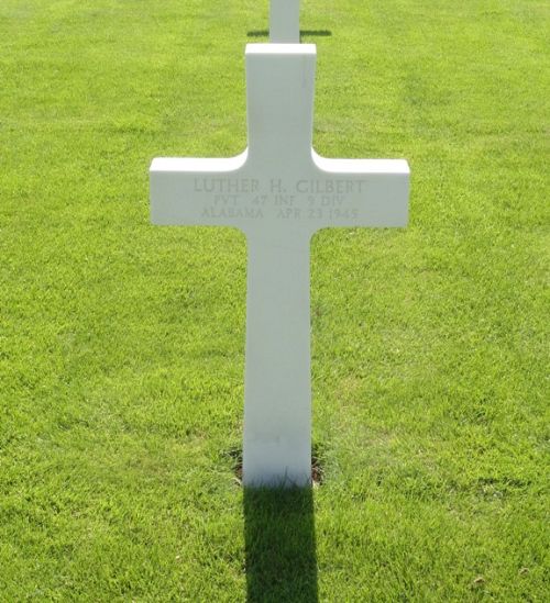Pvt Luther H. Gilbert enlisted in Fort McClellan, Alabama on 29 September 1944.During hiuse to house fighting, Pfc Gilbert was shot in the abdoment. A comrade recalled he walked into a room, holding his guts in his hands and saying "I got shot" before he collapsed on the floor and died.