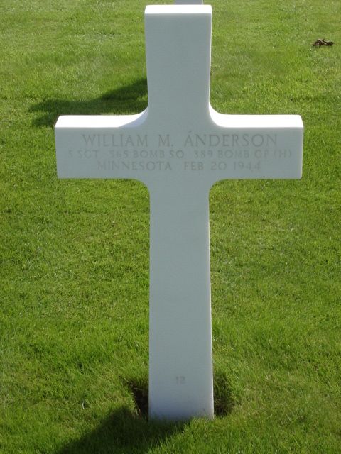 "I first met Bill on the windy plains of an airbase in Pocatello Idaho, Spring of 1943. He was freshly graduated from aerial gunnery school in, I believe, Texas and sported S/Sgt Chevrons, Silver Gunners Wings and a radiant smile which turned out to Bill Anderson's trademark. I was a brand new second lieutenant, a graduate of ten months in a Texas Bombardier School. We were assigned to the crew of First Pilot Lt. Bob Wozniak from Chicago, Illinois. Rounding out with seven other freshly minted air-crew, we graduallly melded together in "Phase Training"in heavy bombers. We flew high above the Rocky slopes of Idaho and surrounding states. Thundering as far south as Biloxi Mississippi. I remember Bill as a bright, ruddy faced, Minnesotoan, wearing a constant half smile, who fell in easily with fellow enlisted men, Max Barlion, George Shady and Bob Hunt, and was always my dependable assistant as an armorer gunner. We grew together as a well knit crew in the cramped quarters of a B-24 in long distance practice missions for three months. We flew in all kinds of weather conditions, day and night. Bombed and strafed desert targets in endless rounds of fire until we became bored with what seemed endless practicing, and actually longed for real combat. Bill looked forward eagerly, as he did with everything. He always accepted his duties as tail gunner seriously and often helped me with pre-flight checks with bomb shackles and pins. Always with his patented smile and friendliness. Off duty Bill enjoyed life with other crew members, tying one on when the occasion allowed, but always back on site when duty called. My last clear recollection was during a fateful mission over Brunswick, Germany on February 20, 1944. Once airborne and safely on course, it was my responsibility to remove the safety pins arming the bombs. Bill assisted in this operation. Finishing this rather delicate manuever, he handed me his pins with a smile, a thumbs up signal and made his way back to his tail gun position. It was the last time I was to see Bill Anderson. After successfully bombing the target at Brunswick we were savagely attacked by a squadron of Folke-Wulfe fighter planes mortally wounding our battle scarred B-24. Listing perilously to starboard and number four engine burning furiously, the fire spreading unchecked, we had no choice but to bail out before the heavy load of gasoline exploded. To the best of my knowledge in the ensuing desperate moments, their was no panic involved, just ten men doing their utmost to clear the obviously stricken ship before a cataclysmic explosion occurred. Miraculously nine of us made it with various small injuries. The tenth one, Bill, was never heard from again. Needless to say the entire crew was devastated by the apparent loss of one of our favorite crewmates. His loss weighed heavily upon us all throughout our entire 15 months of incarceration as prisoners. For my part I have never forgotten Bill Anderson for the brave co-operative airman he was during our brief stay together in the trying years of World War II. I hope this small remembrance helps to bring closure to a brief life well spent for his country."