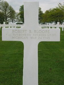1st Lt Robert B. Bloore graduated from Central High School in 1942 and attended Grand Rapids Junior college for one semester.Aircraft 42-50779 was flying on my left wing when we entered the area of the dropping zone. After making a turn to the right to attempt a second run, Lt. Bloore aircraft disappeared in the smoke and was not seen again. At that time we were flying at 200 feet. Lt Bloore died after crash landed.