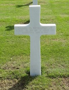 S/Sgt Daniel D. Holliday Jr. was a chauffeur in civil life when he joined the National Guard on 25 November 1940.S/Sgt Holliday's company was mounting an attack about a mile northeast of Seelitz. S/Sgt Holliday was leading his squad toward their objective and had made good progress, being about 250 yards from it. At this point, a German rifleman fired from a ditch at a distance of 200 yards killing S/Sgt Holliday instantly.