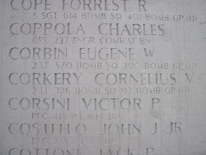 2nd Lt Cornelius V. Corkery attended Loyola College in Montreal, Canada and Fordham College. He was employed at the City Sanitation Department. He received his silver wings at Hondo Army Air Field.Last seen to hit water about 10 minutes off island of Nordernay with one engine on fire, tail chewed up. On 26 July 1943 when it failed to return due to a mid air collision with a German fighter and crashed in the North Sea.