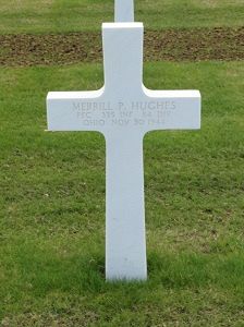 Pfc Merrill P. Hughes graduated from Frankfort High School in 1942 and was attending Kent State University when he enlisted at Fort Thomas, Kentucky on 10 March 1943. He was selected for the A.S.T.P. program and spent nine months at Lafayette College in Pennsylvania. When the program was disbanded, he was transferred to the infantry.He was killed in action by an enemy artillery shell that blasted in a tree.