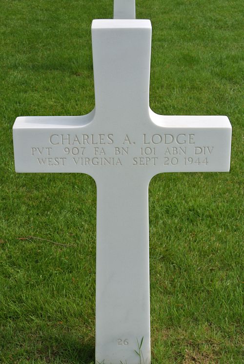 Charles A. Lodge enlisted at Fort Thomas Newport, Kentucky on 24 March 1942.Pvt Lodge kept a diary during much of his service stateside. On 15 August 1942 he described the "last parade" of the 82nd Division, noting "We are now the 101st Airborne, so they say". He added, "we call it foot-borne, which is a better name", no doubt referencing an extensive amount of time spent marching and on drills. On 19 May 1943, Lodge wrote that he had taken his first ride in a glider. His final diary entries are in late August of 1943, when he had returned to Fort Bragg, North Carolina and was awaiting deployment overseas. This included: "Waiting tables in the officer's mess" and "working on equipment and getting ready for......." Some of the last words written in the diaries are, "Motto of the 101st B Battery, We Will, We Can, 101st Do or Die."