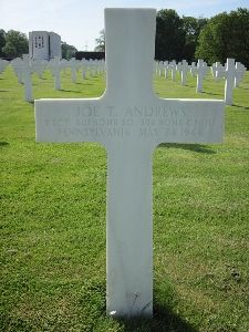 S/Sgt Joe T. Andrews was graduated from Tyrone High School, Class of '41. He went overseas with his crew in April, completing his training in Rapid City, South Dakota. Before enlisting he was employed by the Pennsylvania railroad at the East Altoona roundhouse.He volunteered for the Air Corps of the Army of the United States in Altoona, Pennsylvania on 16 June 1942.