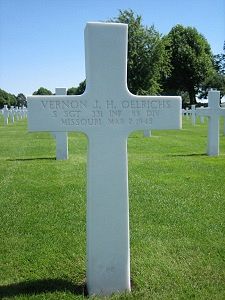 S/Sgt Vernon Oelrichs enlisted at Camp Campbell, Kentucky in March 1943 and was sent overseas in May 1944.Source of information: Peter Schouteten, www.abmc.gov, www.wwiimemorial.com, www.findagrave.com - Laura Phillips, http://83rdinfdivdocs.org/heroes/serial/37513183, www.ancestry.com - 1930 Census / Missouri Marriage Records, www.newspapers.com - The Sedalia Democrat