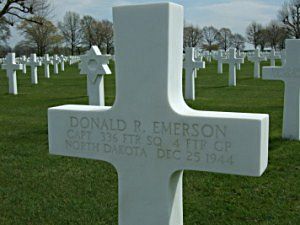 On Christmas Day, 1944, during the Battle of the Bulge, he was heading back to base after a mission when he encountered six enemy planes. He managed to shoot down two of them, but as he crossed enemy lines flying close to the ground, he was struck by flak from anti-aircraft guns. He was buried the next day in a temporary military cemetery near Margraten, The Netherlands, where his body is now permanently interred in the American Military Cemetery. Victories: Air 4,5 and Ground 2,5.