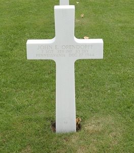 T/Sgt John E. Orendorff graduated from William Penn Senior High School with the class of 1940 and was employed at the York Safe and Lock Company.He enlisted in Harrisburg, Pennsylvania on 30 September 1942 and was sent overseas in April 1944.