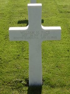 Sgt William H. Pace was a routeman before he enlisted at Fort Jackson, Columbia, South Carolina on 12 September 1942.He is remembered at Mount Pleasant Memorial Gardens in Mount Pleasant, South Carolina.