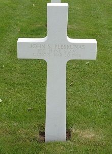 Pfc John S. Pleskunas was wounded in action by a shell fragment in July 1944 and returned to duty in December 1944. He was awarded the Purple Heart Medal for this wounds.Source of information: Peter Schouteten, Terry Hirsch, Astrid van Erp, www.abmc.gov, www.wwiimemorial.com, www.ancestry.com - Headstone and Interment Record, Cook County Birth Certificates, 1930 US Census