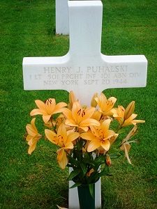 He was awarded the Silver Star Medal posthumously. The citation reads: “Lt. Henry J. Puhalski, parachute infantry, while serving with the Army of the United States, distinguished himself by gallantry in action. On 20 September 1944, his battalion was engaged with the enemy in the vicinity of Dinter, Holland. During the attack, the enemy lines began to waver. Lt. Puhalski, aware of this situation, rushed to the head of his platoon with complete disregard for his personal safety and led his men directly against the enemy. Despite the fact that he was facing 100 men with his single platoon, he brought about a mass surrender of the enemy. Just as the white flag was being displayed, Lt. Puhalski was mortally wounded. As a result of his inspiring leadership and outstanding courage and initiative, a large number of the enemy were taken prisoner. His conduct was in accordance with the highest standards of the military service.”
