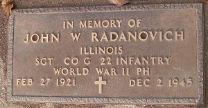 The Defense POW/MIA Accounting Agency (DPAA) announced that Sgt John W. Radanovich, was accounted for on 11 May 2023.In November 1944, Radanovich was assigned to G Company, 22nd Infantry Regiment, 4th Infantry Division. His rifle platoon was engaged in battle with German forces near the town of Grosshau, in the Hürtgen Forest, Germany when he was reported missing in action on 1 December 1944. Despite continued progress against German fighting positions, many soldiers were killed along the Company G battle line. The Germans never reported Radanovich as a prisoner of war, and his remains were not immediately recovered. The War Department issued a presumptive finding of death on 2 December 1945.