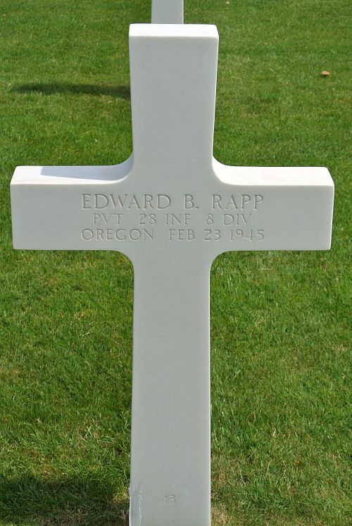 Pvt Edward B. Rapp enlisted in Fort Lewis, Washington on 6 June 1944.He was a graduate of Salem High School and was employed at Swift & Co. Company before entering the army. He received infantry training at Camp Joseph T. Robinson, Arkansas and went overseas in November 1944.