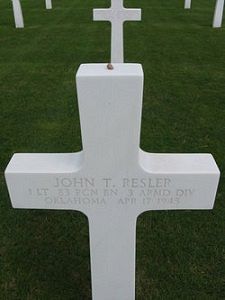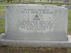 1st Lt John T. Resler attended the Oklahoma Military Academy in Claremore, Oklahoma and graduated in 1940. He then attended Oklahoma A&M in Stillwater, Oklahoma, but while in the senior year, enlisted into the Army at Claremore, Oklahoma on 25 February 1942.Lt Resler was killed in action by a sniper while trying to rescue one of his wounded men. He received a posthumous award of the Bronze Star of Valor for the action that cost him his life. The citation reads in part: For heroic action against the enemy in Germany on 17 April, 1945. First Lieutenant Resler in command of a platoon took part in the attack on the town of Thurland, Germany and in the assault one of his tank crew dismounted to procure more ammunition from a nearby ammunition carrier. The man was shot in the arm and fell to the ground. Lt Resler with utter disregard for his own personal safety went to his aid in spite of heavy small arms and bazooka fire. As he reached his side he was fired upon by several snipers and mortally wounded. Lieutenant Resler’s courage which resulted in the sacrifice of his own life and his high sense of duty reflect the greatest credit upon himself and the armed forces”