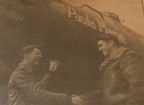 On one picture Pvt Roan on right is shaking hands with Lt. William S. Holden, pilot of newly named Flying Fortress.