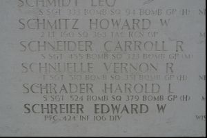 T/Sgt Vernon R. Schnuelle entered the bomb bay to release hung up bombs, but lack of space prevented him wearing his parachute. He fell out when the bombs were released.The Co Pilot, Ralph Forsaith is still living and lives in Maine at the age of 95 (in January 2017). He remembers the mission and T/Sgt Schnuelle. He remembers T/Sgt Schnuelle flew in to Pearl Harbor on 7 December 1941, the day of the Japanese attack, and then flew his required number of missions in the Pacific and after that volunteered to go to the Atlantic Theater.