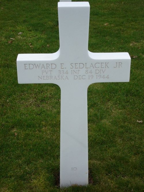 Pvt Edward E. Sedlacek Jr. worked as a farm hand and operated the Sedlacek Bar in Clarkson, Nebraska.He enlisted in Fort Leavenworth, Kansas on 21 March 1944.