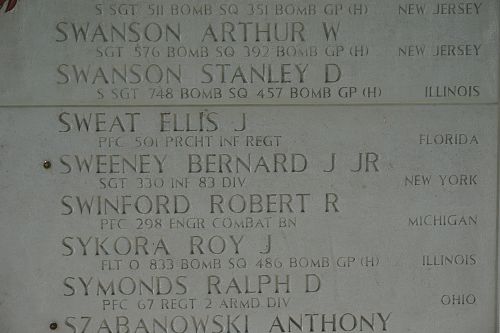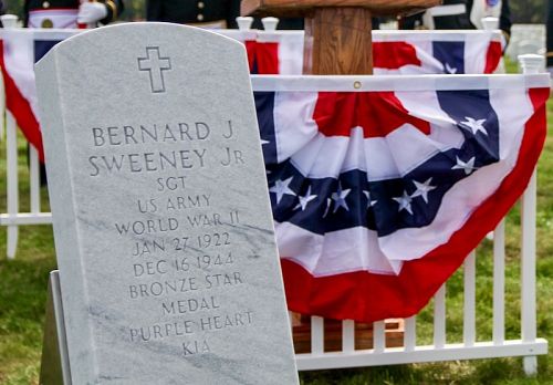 Sweeney’s name is recorded on the Walls of the Missing at Netherlands American Cemetery, an American Battle Monuments Commission site in Margraten, the Netherlands, along with the others still missing from World War II. A rosette will be placed next to his name to indicate he has been accounted for.