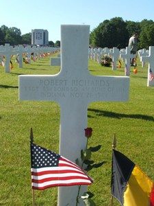 S/Sgt Robert Richards attended South Whitley High School for three years.Airplane was attacked by German fighter planes and received a large number of hits with explosive cannon shells. All forms of inter-communication were shot out as was alarm bell. It was impossible to move about in aircraft because of an uncontrolable fire in the bomb bay. Sgt Remberger and Sgt Duncan were on the flight deck and were killed by enemy fire. The exact fate of Sgt Raybould, Sgt Burnett, Sgt Richards, Sgt Martin and Lt Tolin is unknown but the best knowledge and belief of the undersigned the above named were all killed either by the fire of the German fighter planes or the explosion of the aircraft.