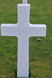 Sgt Paul A. Hagmann graduated from Redlands High School in 1930.T/Sgt Gerald D. Mason, 17034081, member of crew of A/C #878, reports: "The B-24D 232, piloted by Lt O´Neill, swung over behind us, slightly to the right, and about 5:30 high. They dropped their bombs on the swing. This was just over the target at about 1225 hours, altitude 21,000 feet. The A/C appeared to be hit by flak or bombs from the A/C in the formation above. The right wing came off at #4 engine. The ship went into a spin, caught on fire, and crashed. No parachutes were seen."