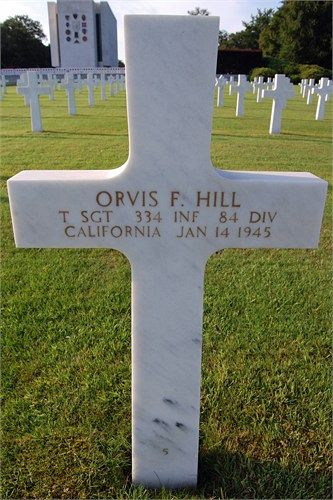 T/Sgt Orvis F. Hill enlisted in Sacremento, California on 3 December 1942.He was killed while on patrol in a forest just outside Samree, Belgium.