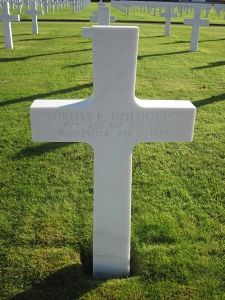 Pvt Kurtiss P. Holmquist attended high school for 3 years. He enlisted at Fort Snelling, Minnesota on 6 September 1944.He was part of a patrol which was to cross the Elbe River at Havelberg to pick up German prisoners. The patrol was enveloped by SS troops in armored cars and of the original total of twenty one men, records reveal that sixteen men were taken prisoner and later released. Field investigations conducted in the area on 30 March, 22 November and 18 December 1948 failed in the recovery of the remains of two men, Sgt Lance and Pvt Nick Botsis who ara remembered at the Walls of the Missing at Margraten. Two other patrol members, Robert Bender and Kurtiss P. Holmquist are interred at Ardennes.