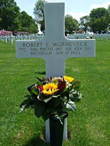 Pfc Robert E. Morneweck attended Northwesten High School in Detroit where he enrolled into the R.O.T.C. program.He was reported wounded in action during the defense of Bastogne. For this wound he was awarded the Purple Heart Medal a first time. When the wounds had healed, he went back to his unit on the frontline.