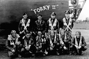 On the other side of the target, three German fighters came up at them from the deck. Bridges, the veteran of 53 missions, many with the Royal Air Force, got in his last rounds of battle. The fighters left FORKY II burning in a cornfield with the nose buried in the ground and the tail standing. Bridges staggered out of the wreck as it exploded!"
