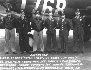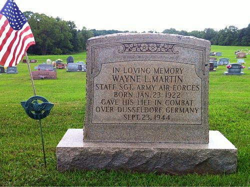 The aircraft was hit by flak over the target area. The left wing was shot off, the plane flipped over on its back and went down in a spin. No parachutes were seen to leave the aircraft. The entire crew of six men was killed.S/Sgt Wayne L. Martin is remembered at Bartlett Cemetery in Bartlett, Washington County, Ohio with a memorial marker.