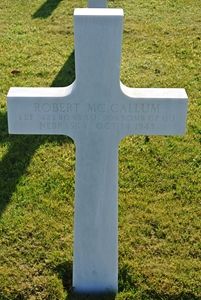 Robert McCallum attended Doane College and signed up with the RAF in 1942 because he was a native of Scotland. His parents and brother John were all born in Scotland and immigrated to the United States, arriving in New York with the SS Columbia on 10 April 1923.The airplane was attacked by German fighters. Controle cables were destroyed which made flying the airplane very hard. According to surviving crew members, Lt McCallum was keeping the airplane as level as possible so the other crew members could bail out and thus gave his life to safe others.