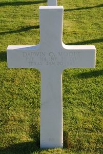 Pvt Darwin O. Moore was first buried at Block HH, Row 11, Grave 274.Source of information: Peter Schouteten, Terry Hirsch, www.abmc.gov, www.wwiimemorial.com, www.ancestry.com - U.S., Headstone and Interment Records for U.S. Military Cemeteries on Foreign Soil / 1940 Census, www.314threunion2009.org, WWII Draft Card
