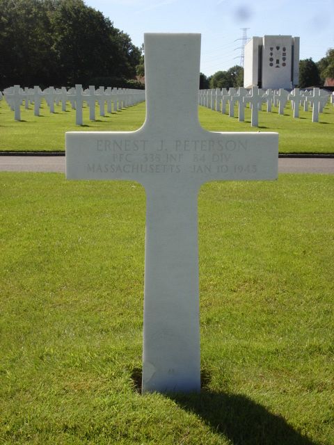 PFC Ernest J. Peterson enlisted in Boston, Massachusetts on 9 March 1943.Source of information: André Koch, Terry Hirsch, www.abmc.gov, www.wwiimemorial.com, www.archives.gov – WWII Enlistment Record, www.ancestry.com - 1930 Census / U.S., Headstone and Interment Records for U.S. Military Cemeteries on Foreign Soil, WWII Draft Card