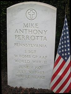 Mike A. Perrotta entered the Service from Erie, Pennsylvania on 17 July 1942.Returning from a bombing mission to Kassel, Germany the limping aircraft was attacked by a German fighter and was shot down. Eight crew members bailed out but were attacked by the German aircraft. From a crew of ten, two died in the aircraft, six died as a result of the strafing, and the other two were captured by German ground forces.