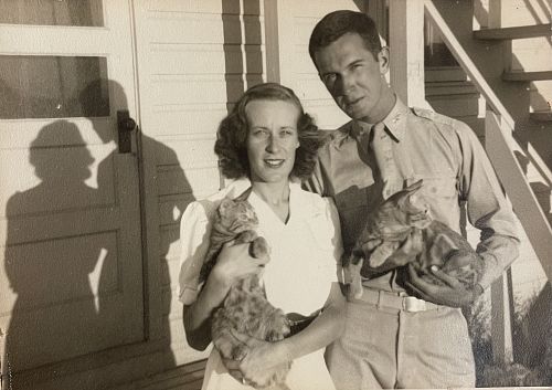 Skip's draft registration card, dated 1 July 1941, describes him as 6 feet, 1 inches tall and weighing 139 pounds, brown hair and blue eyes. He enlisted in the US Army right out of university on 19 May 1942. He and Shirley were married 8 September 1943 in Salt Lake City, UT, where he was stationed for military training as a paratrooper. There they lived in military housing with their 2 cats. The attached photo was taken in front of their housing quarters. (After much thought, l decided to send this electronic version of the only photo I have of Skip and Shirley. It seems the safest and fastest way to share this with you. Please let me know if this comes through well...I can resend it from my phone if not.)