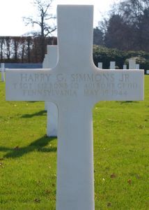 T/Sgt Harry G. Simmons, Jr. graduated from Grove City High School and worked in a chemical plant.He enlisted in Altoona, Pennsylvania on 24 August 1942 and was sent overseas in October 1943.