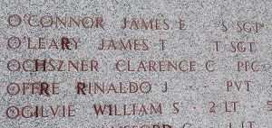 Private First Class Clarence C. Ochszner enlisted on 18 October 1942, at Fort Snelling, Minnesota. He was sent overseas in August 1944.Per Dr. Jack T. Prior: "At 8:30 p.m. Christmas Eve, as I was about to step out the door for the hospital I heard the screeching sound of the first bomb. I ran outside to discover that the three-story apartment serving as my hospital was a flaming pile of debris about six feet high. The night was brighter than day from the magnesium flares the German bomber pilot had dropped. Our team headquarters about a block away also received a direct hit and was soon in flames.