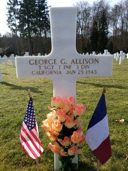 T/Sgt George G. Allison attended high school for four years and was a routeman, employed by the City Ice and Fuel Company, before he enlisted in Fresno, California on 19 March 1943.He was killed by artillery shell fragments in his head.