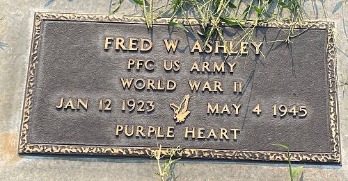 Pfc Fred W. Ashley was employed at the Boise Payette Lumber Company before he enlisted in Boise, Idaho on 16 January 1943.On 4 May 1945, Pfc Fred Ashley was reported missing in action while on a reconnaissance mission in former Czechoslovakia. He was mortally wounded. The last time any American saw him, German troops were taking him away.
