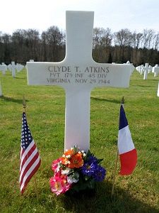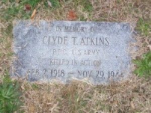 Pvt Clyde T. Atkins attended high school for 4 years before he enlisted in Richmond, Virginia on 14 January 1944.He is remembered at the Saint Stephens Baptist Church Cemetery in King and Queen County, Virginia.