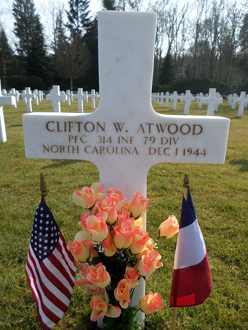 Pfc Clifton W. Atwood enlisted at Fort Bragg, North Carolina on 18 June 1942.His company commanding, Captain E. L. Halliburton, wrote a letter to his brother, explaining what happened on that tragic day: On 1 December 1944, the company of which your brother was a member was taking part in the attack on the enemy held city of Haguenau, France. Before reaching this city there was a dense forest that had to be taken from the enemy and it was being heavily defended. It was during this attack by our forces, which eventually liberated the city of Haguenau, that Clifton was hit and instantly killed by enemy machine gun fire. A medical aid man rushed to his assistance when he was hit but Clifton was dead when the aid man reached him.