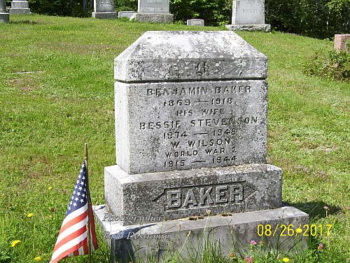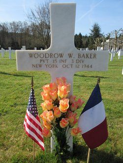Pvt Woodrow W. Baker had a post graduate degree from SUNY (State University of New York) and was a teacher employed by the Central District School in Ellenburg before he enlisted in Albany, New York on 6 November 1943.Pvt Baker is remembered with a memorial marker at Sheldon Hill Cemetery in Ellenburg Depot, Clinton County, New York.