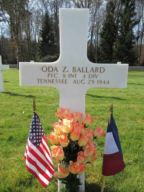 Pfc Oda Z. Ballard attended high school for 3 years before he joined the National Guard in Dickson, Tennessee on 16 September 1940.He was first buried at the Temporary American Military Cemetery in Solers, France.